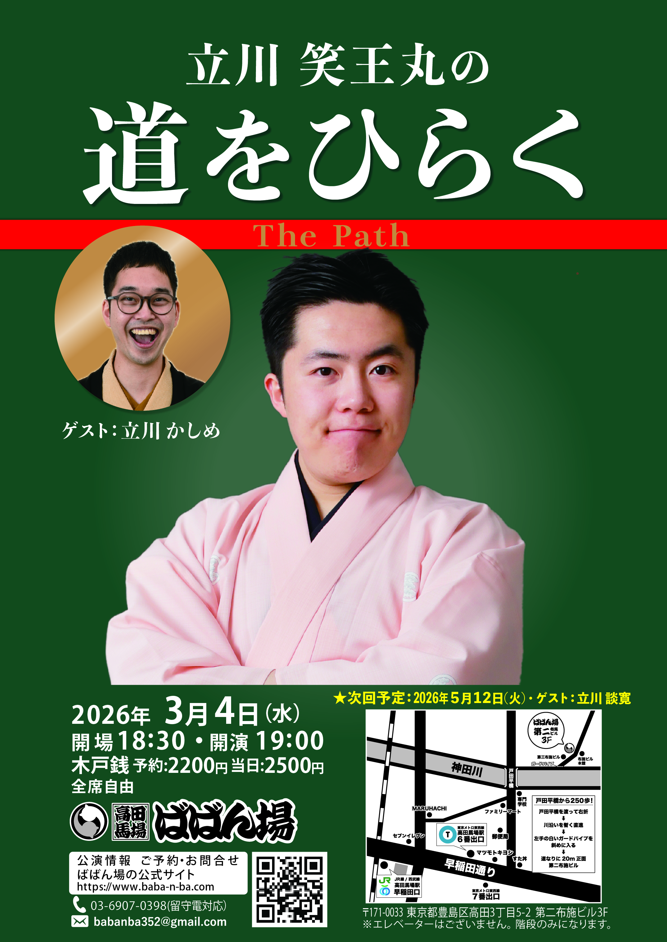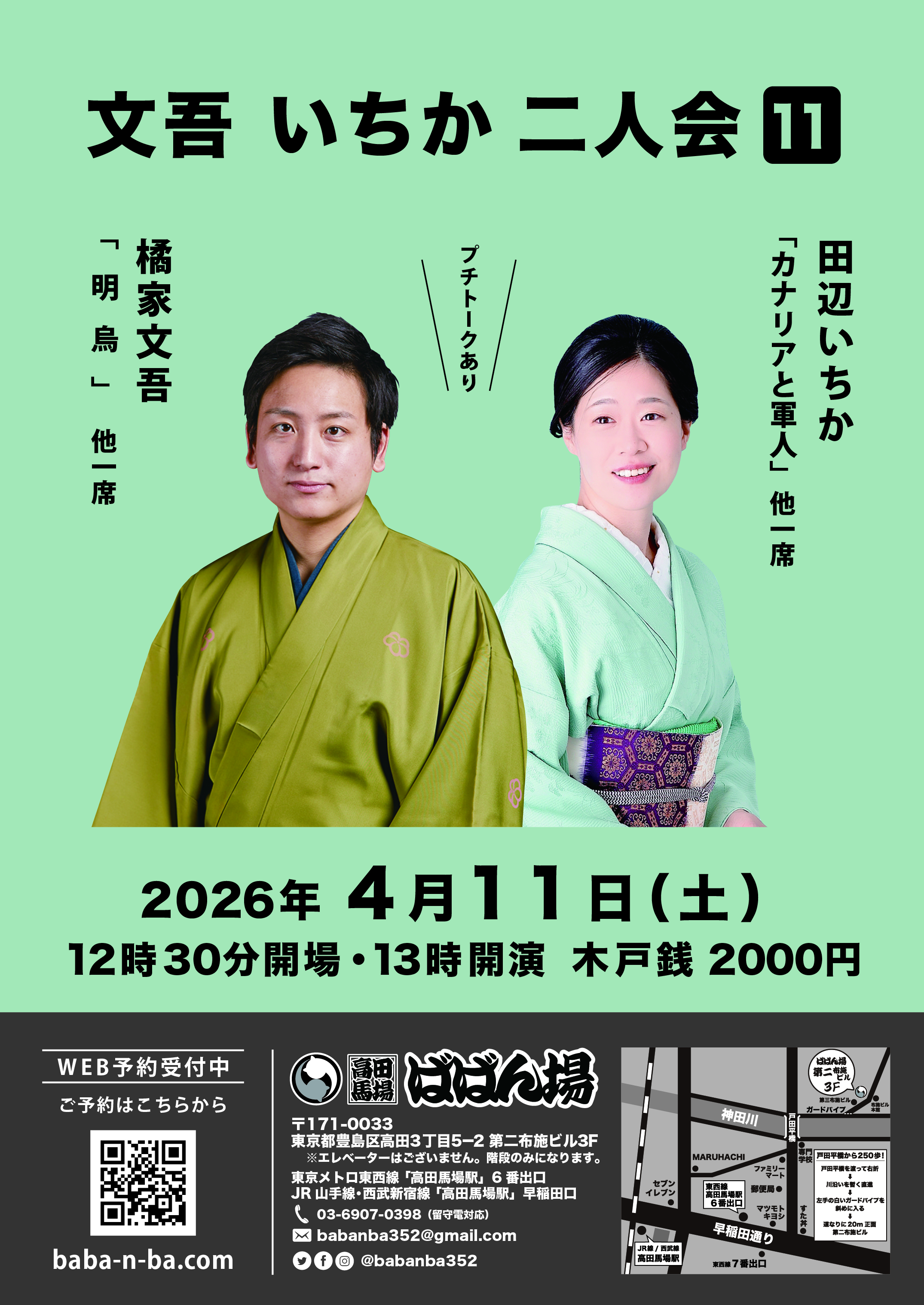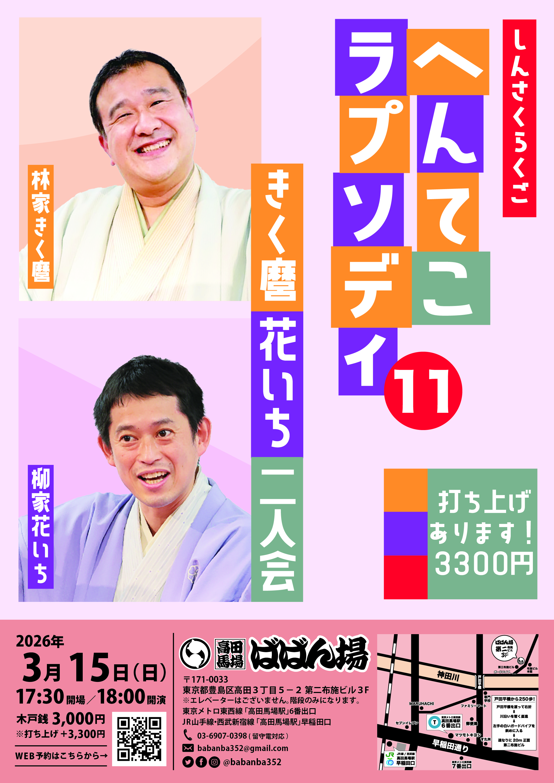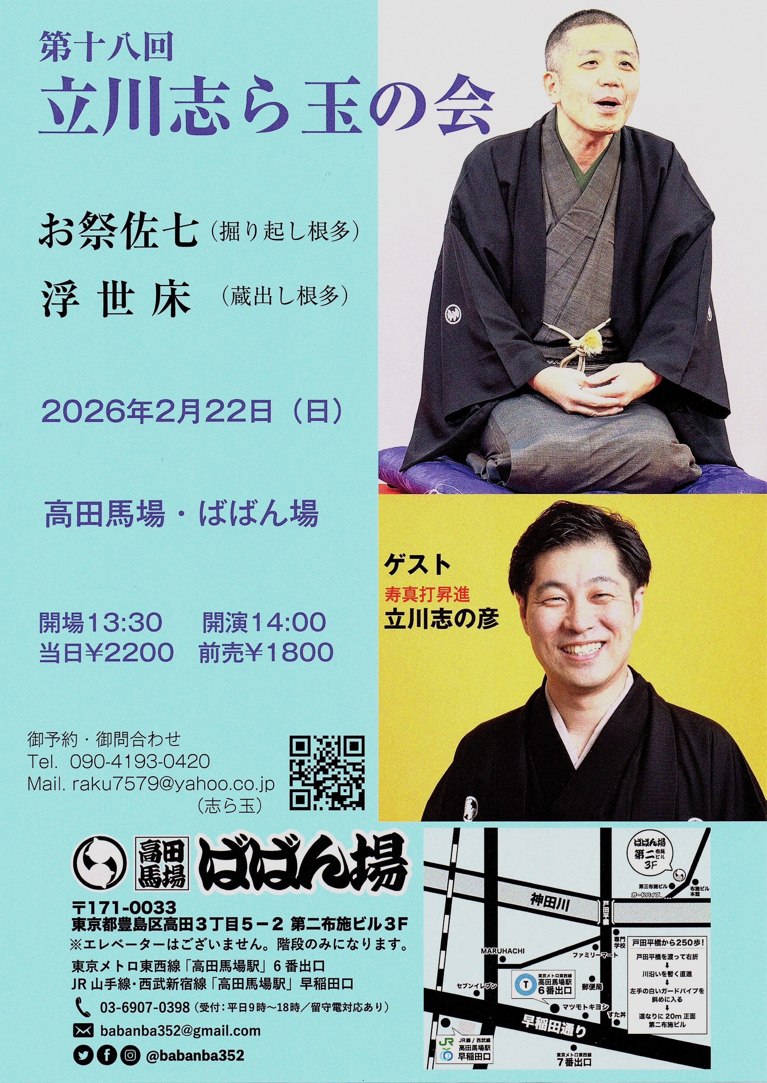 百栄・ 志の春 二人会1418:30開場/19:00開演木戸銭3,000円[出演]春風亭百栄立川志の春打ち上げあり(別会費3,300円)※ご予約の際に、打ち上げに参加or不参加をお選びください。