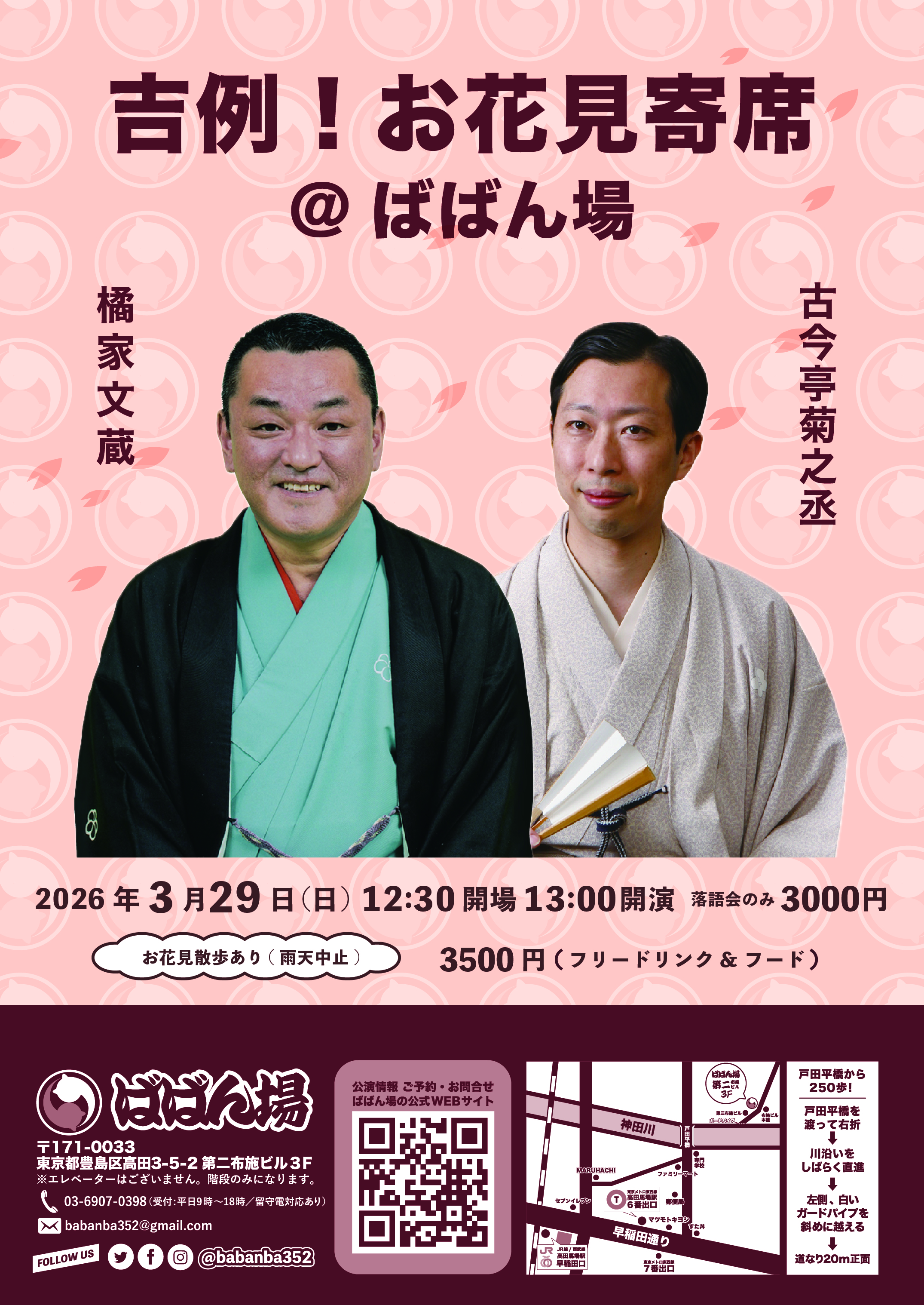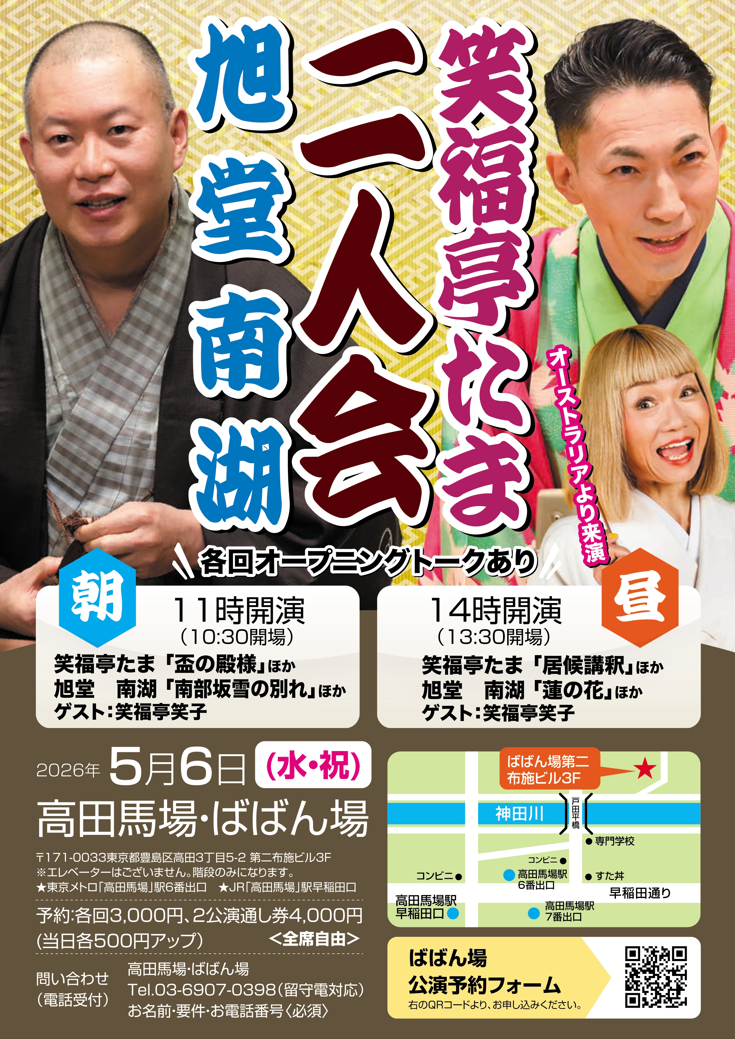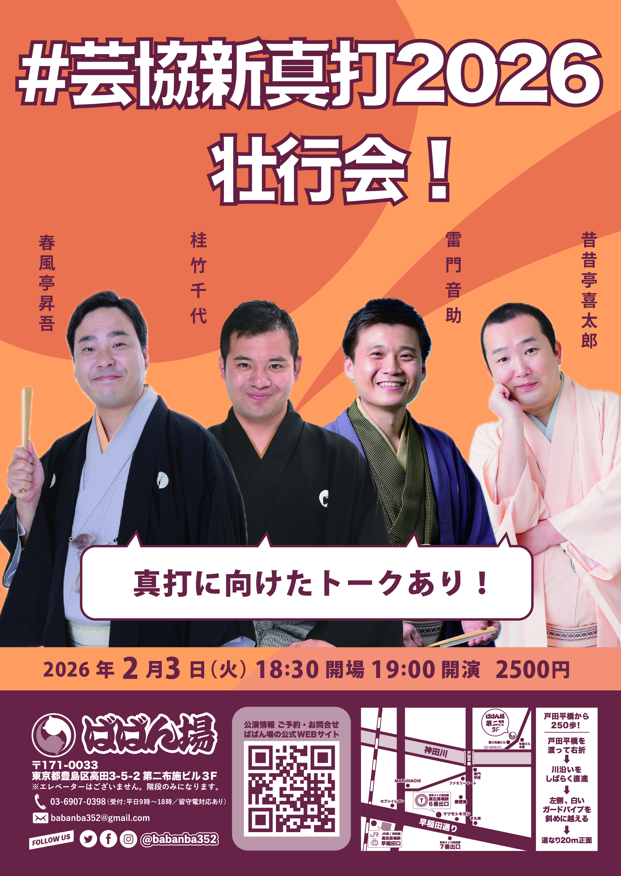 百栄・ 志の春 二人会1418:30開場/19:00開演木戸銭3,000円[出演]春風亭百栄立川志の春打ち上げあり(別会費3,300円)※ご予約の際に、打ち上げに参加or不参加をお選びください。