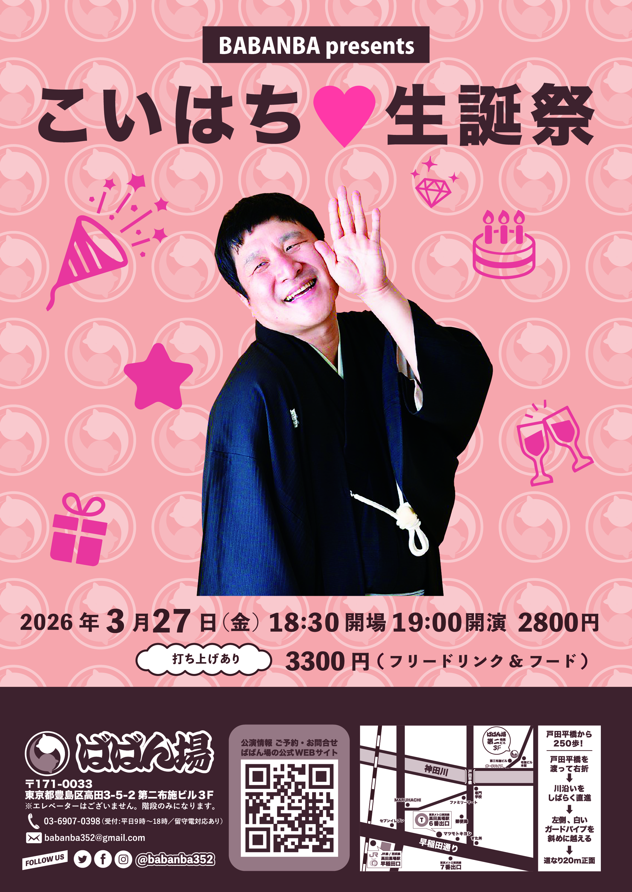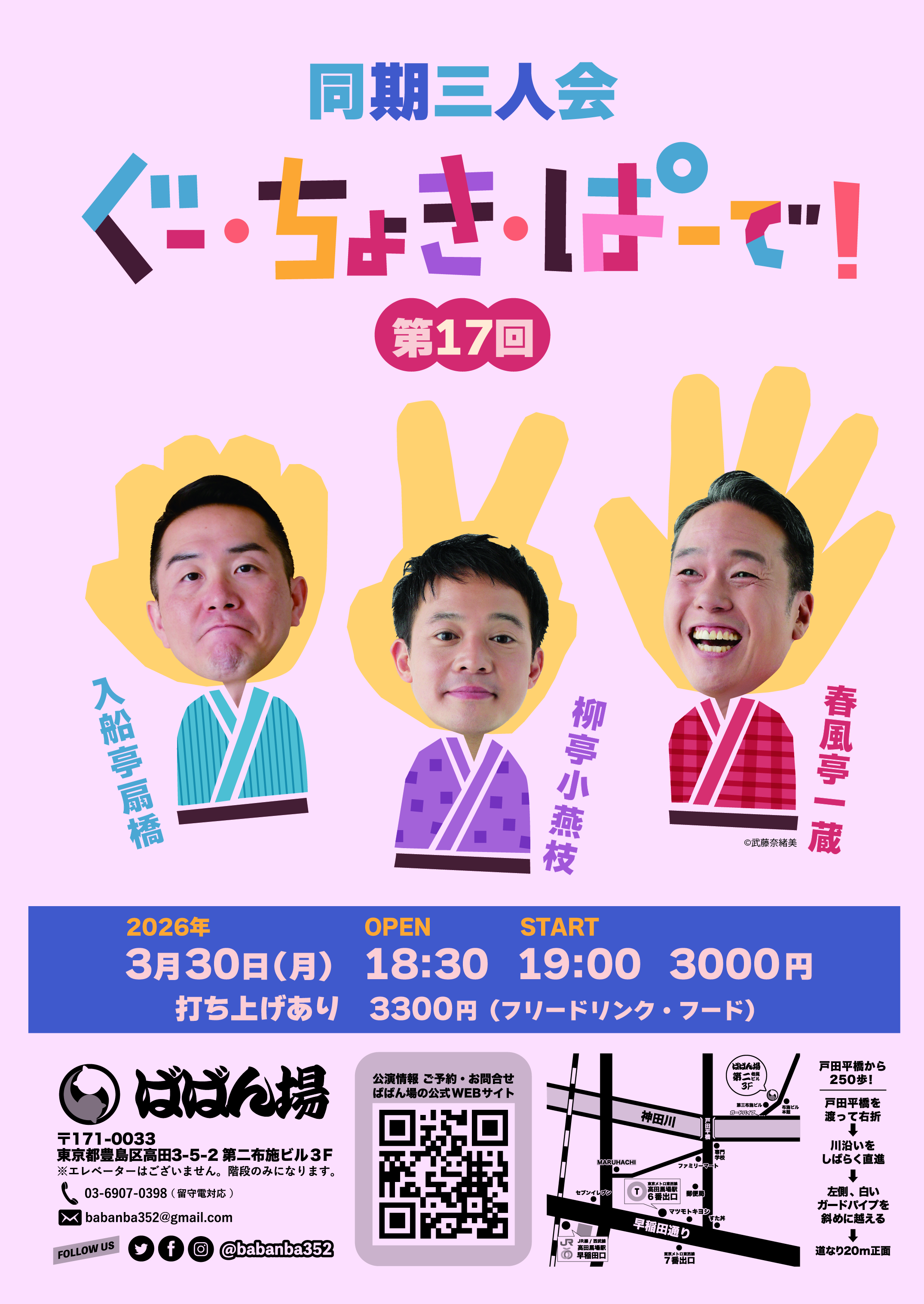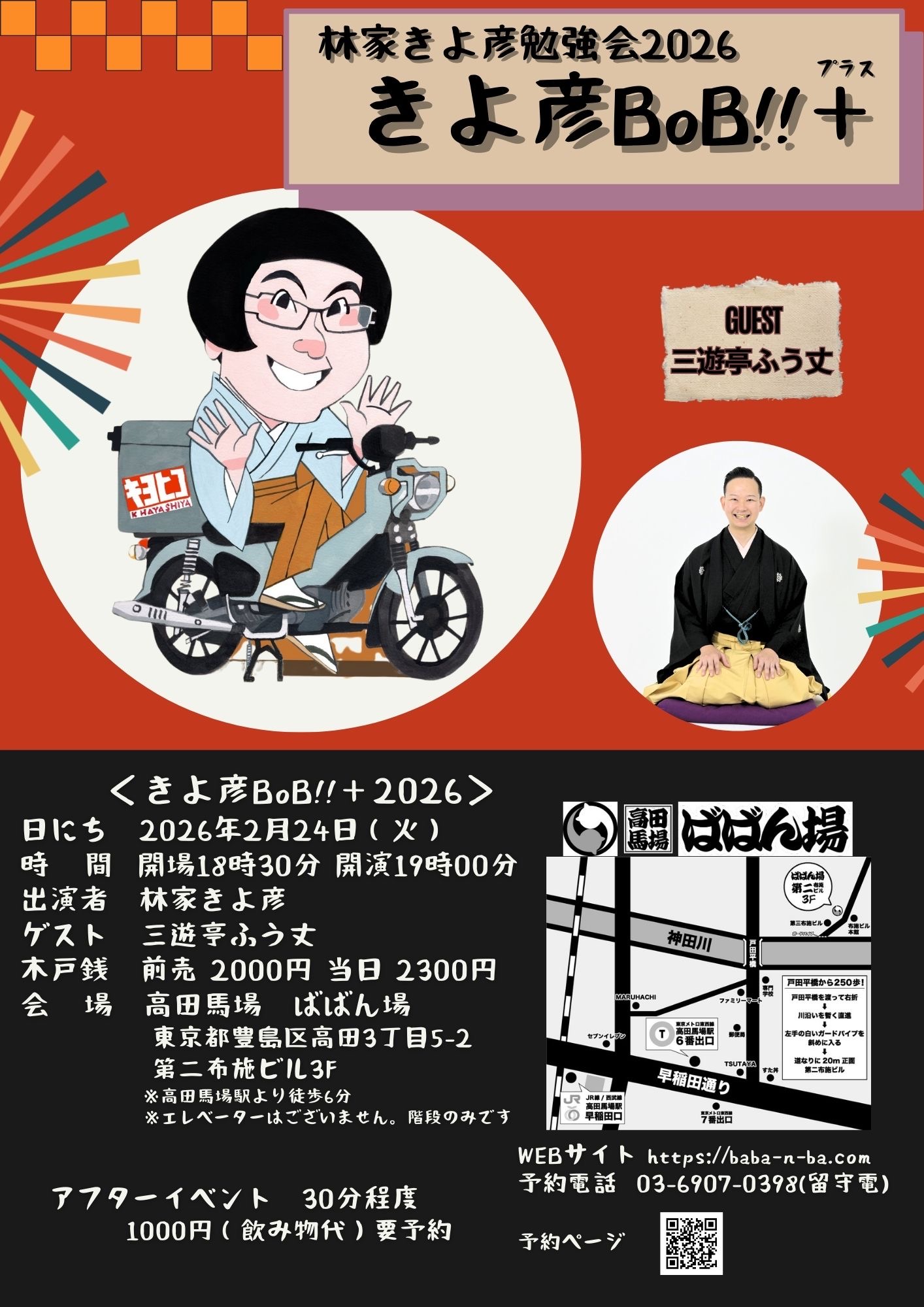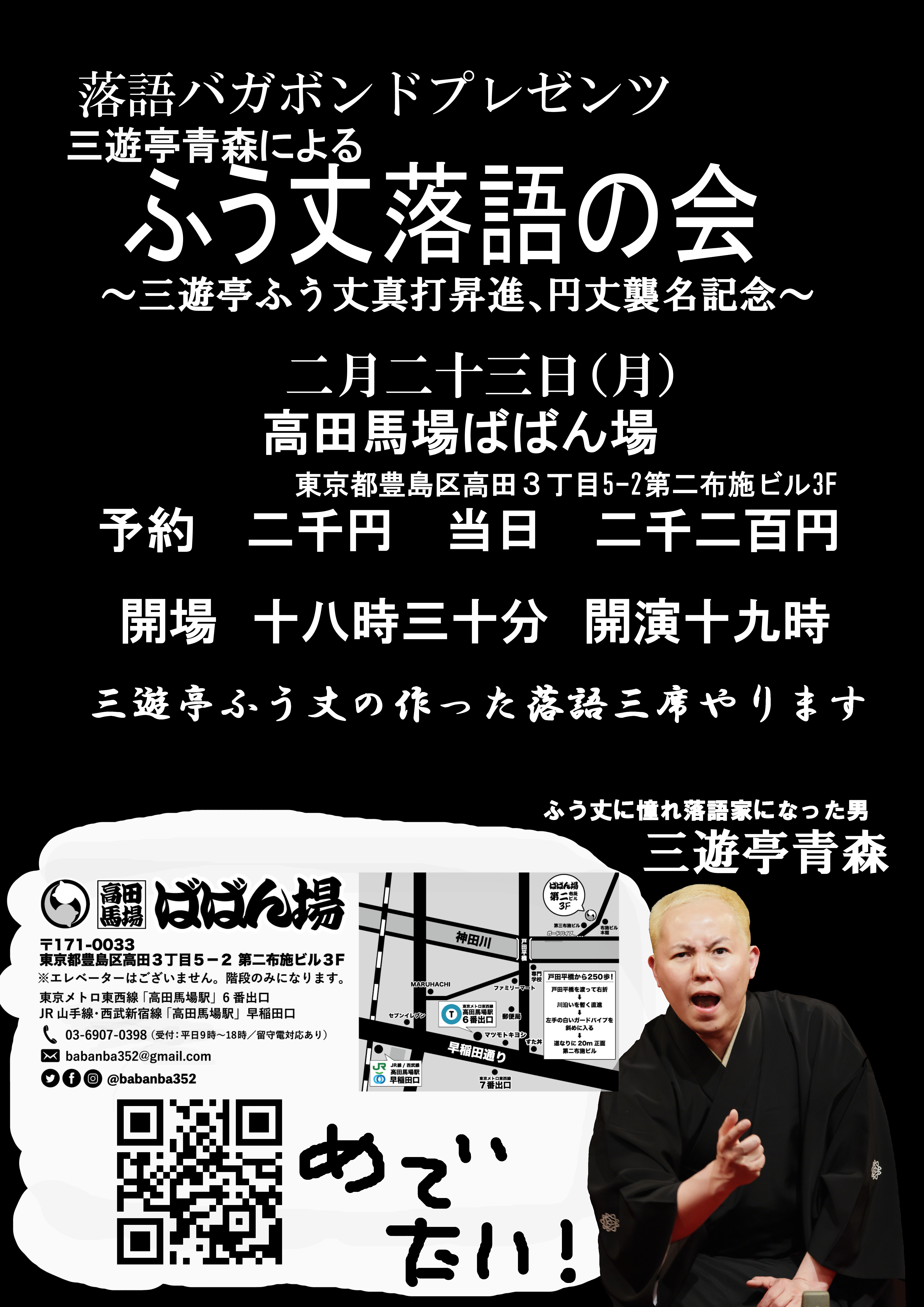 百栄・ 志の春 二人会1418:30開場/19:00開演木戸銭3,000円[出演]春風亭百栄立川志の春打ち上げあり(別会費3,300円)※ご予約の際に、打ち上げに参加or不参加をお選びください。