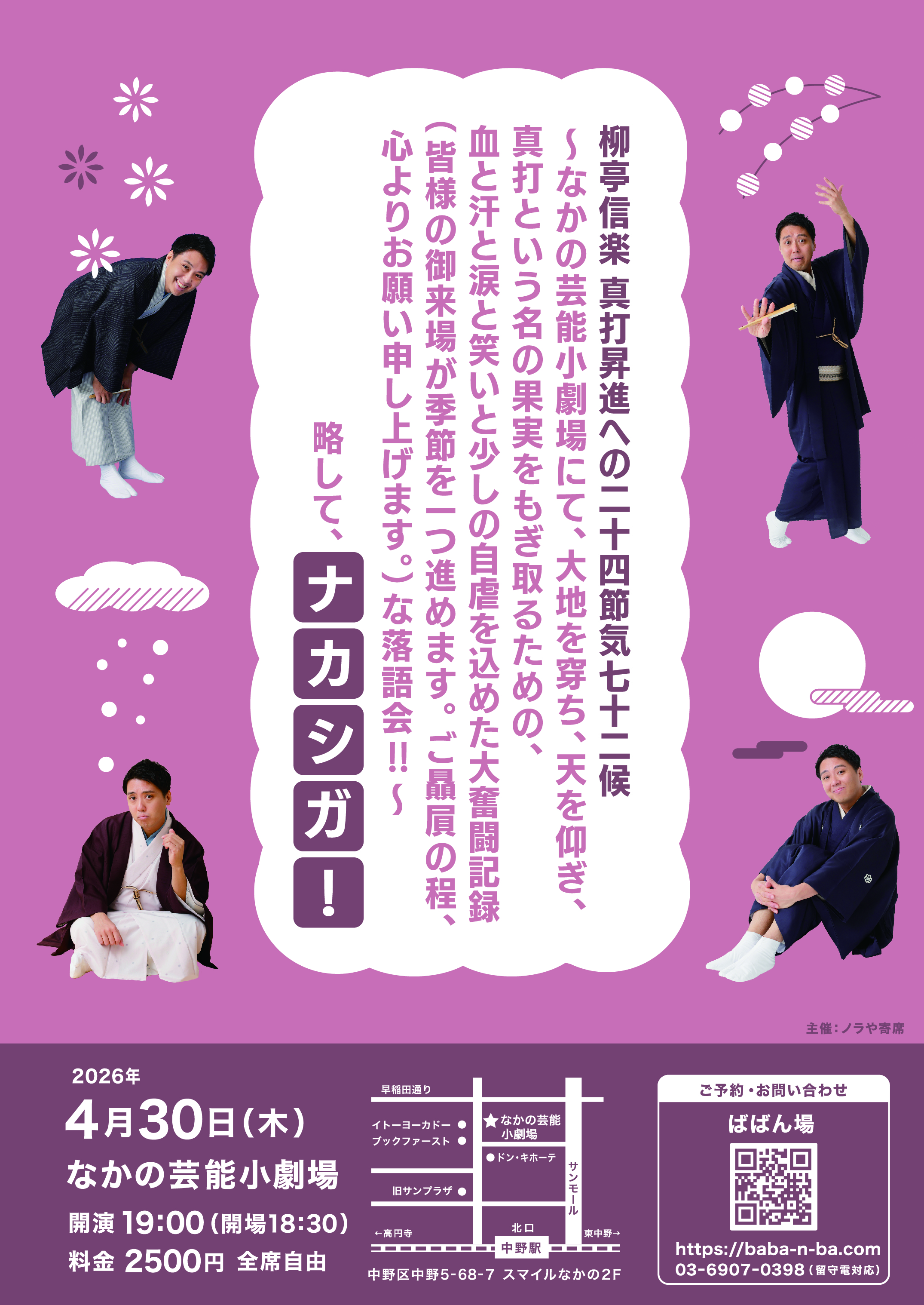 ※ノラやホームページ、チケットぴあ(Pコード:539078)、カンフェティにて12月24日よりチケット発売。12/23開催の「セシオン=であい寄席 第二回」にてチケット先行販売。
